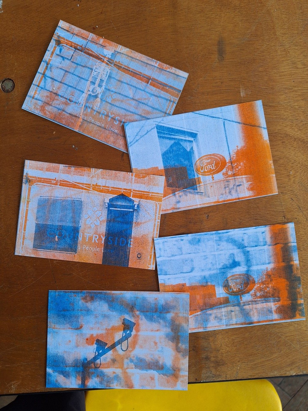 1x risograph zine, 6x two-colour risograph postcards, 1x three-colour risograph postcard (random)