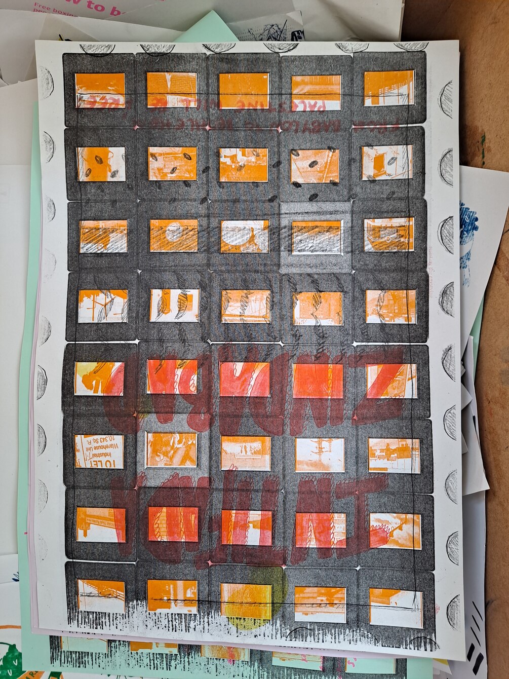 When printing my double-sided poster Death To The Road, the black stencil had an error and we printed about 100 misprints to get the stencil back in action. These misprints were printed over other artists' test prints, and the coincidences are pretty exciting.